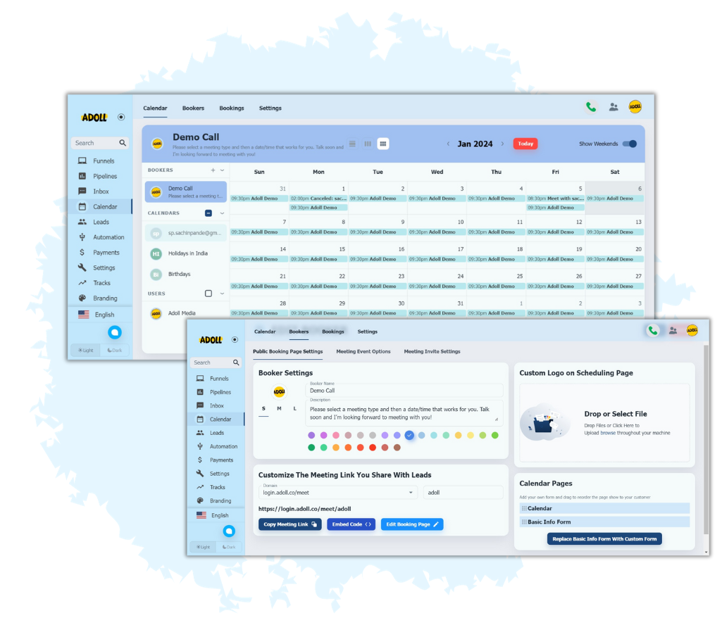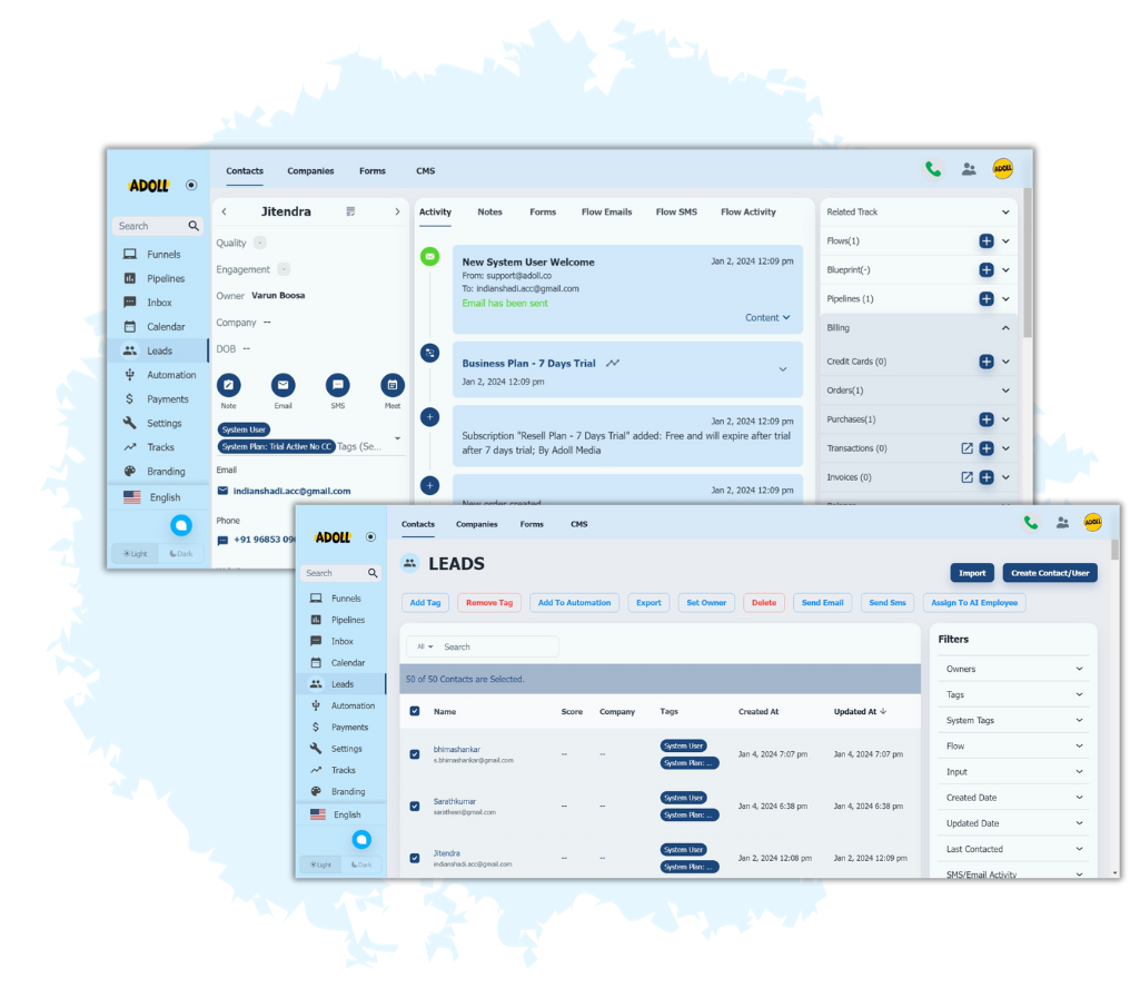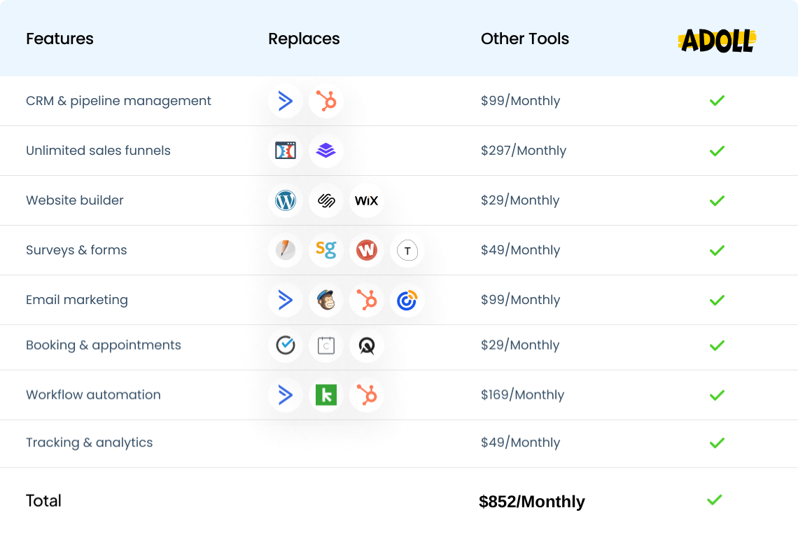 Adoll is all-in-one software & system to run, manage online business that manage all your leads, invoices, customers, employees, funnels, landing page, emails, automations, everything in one place.